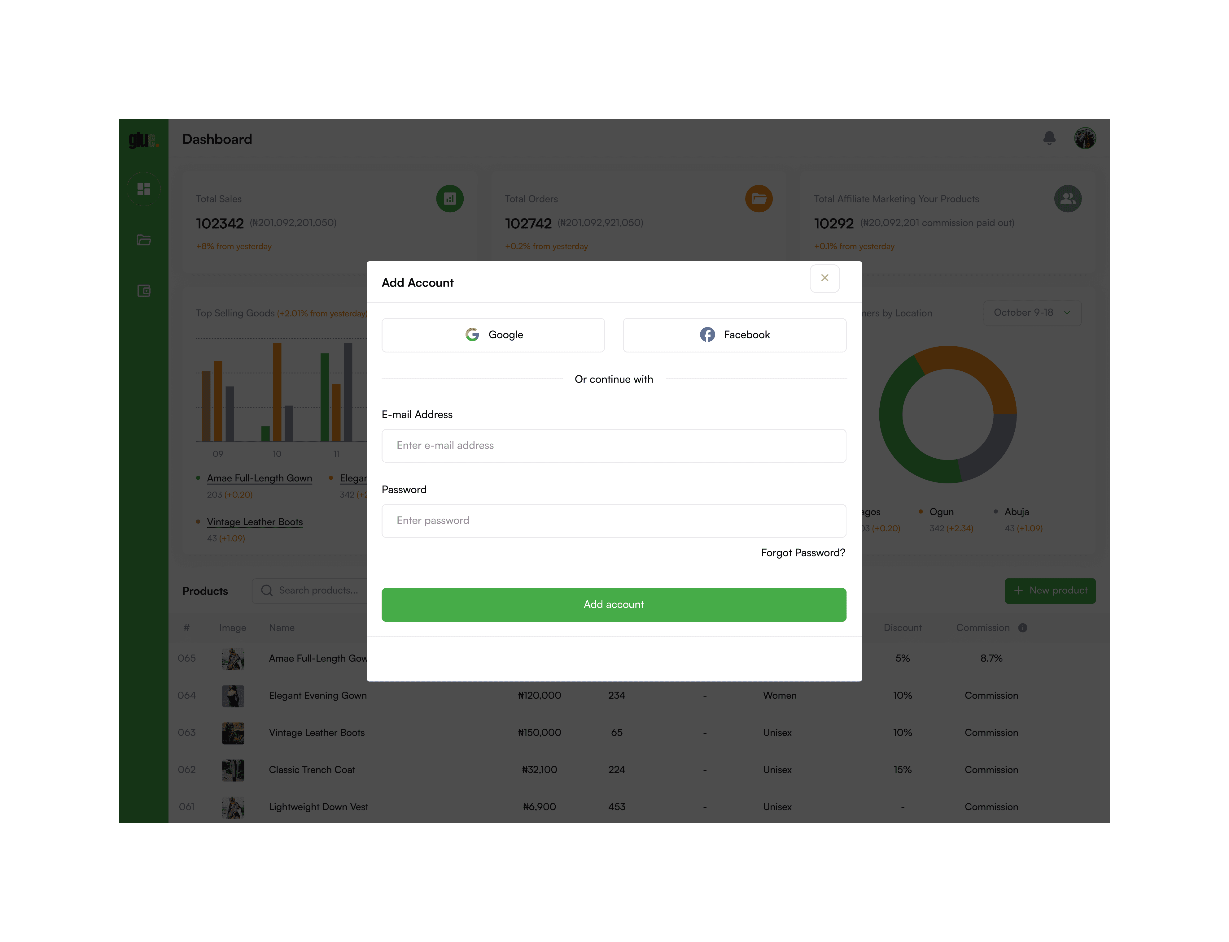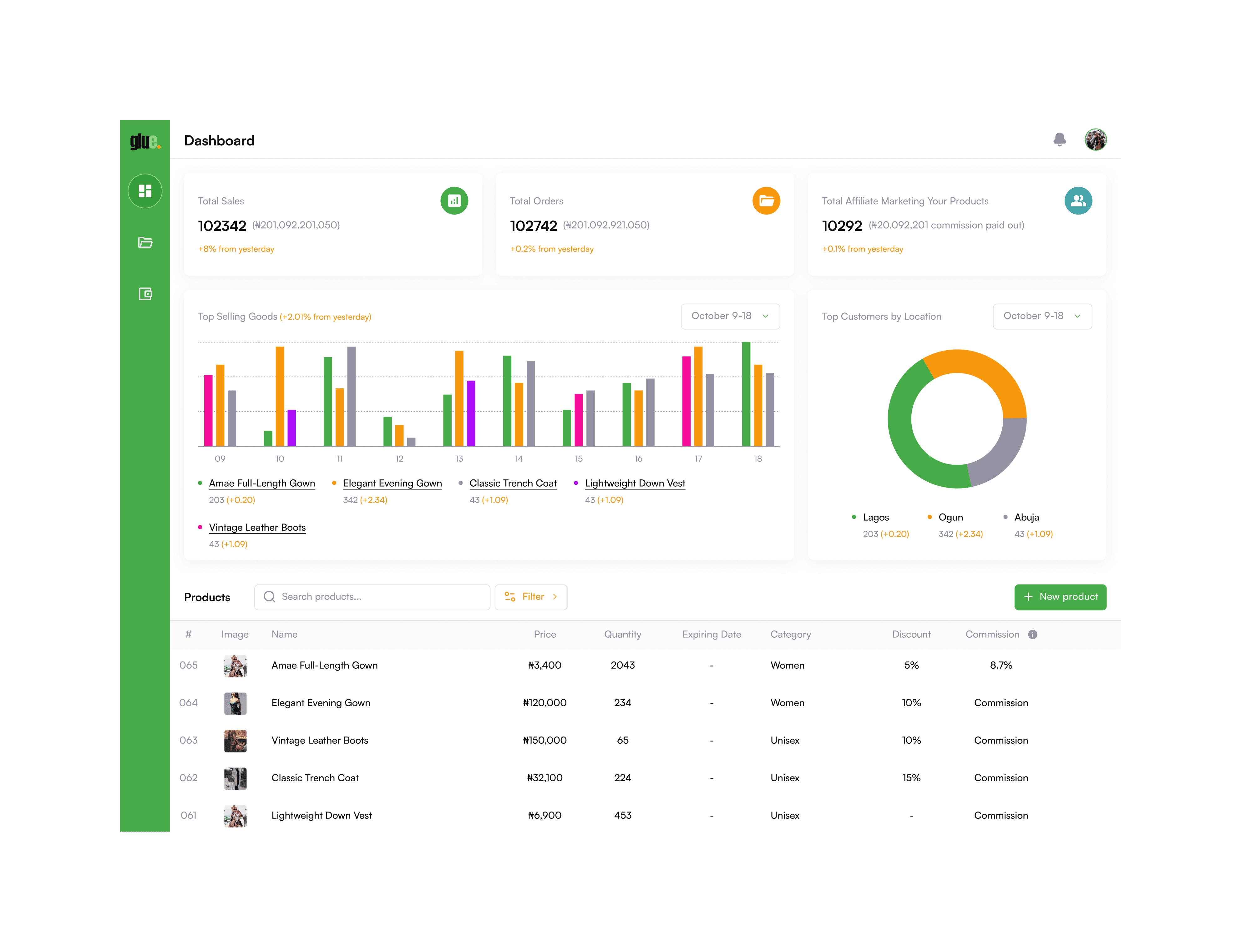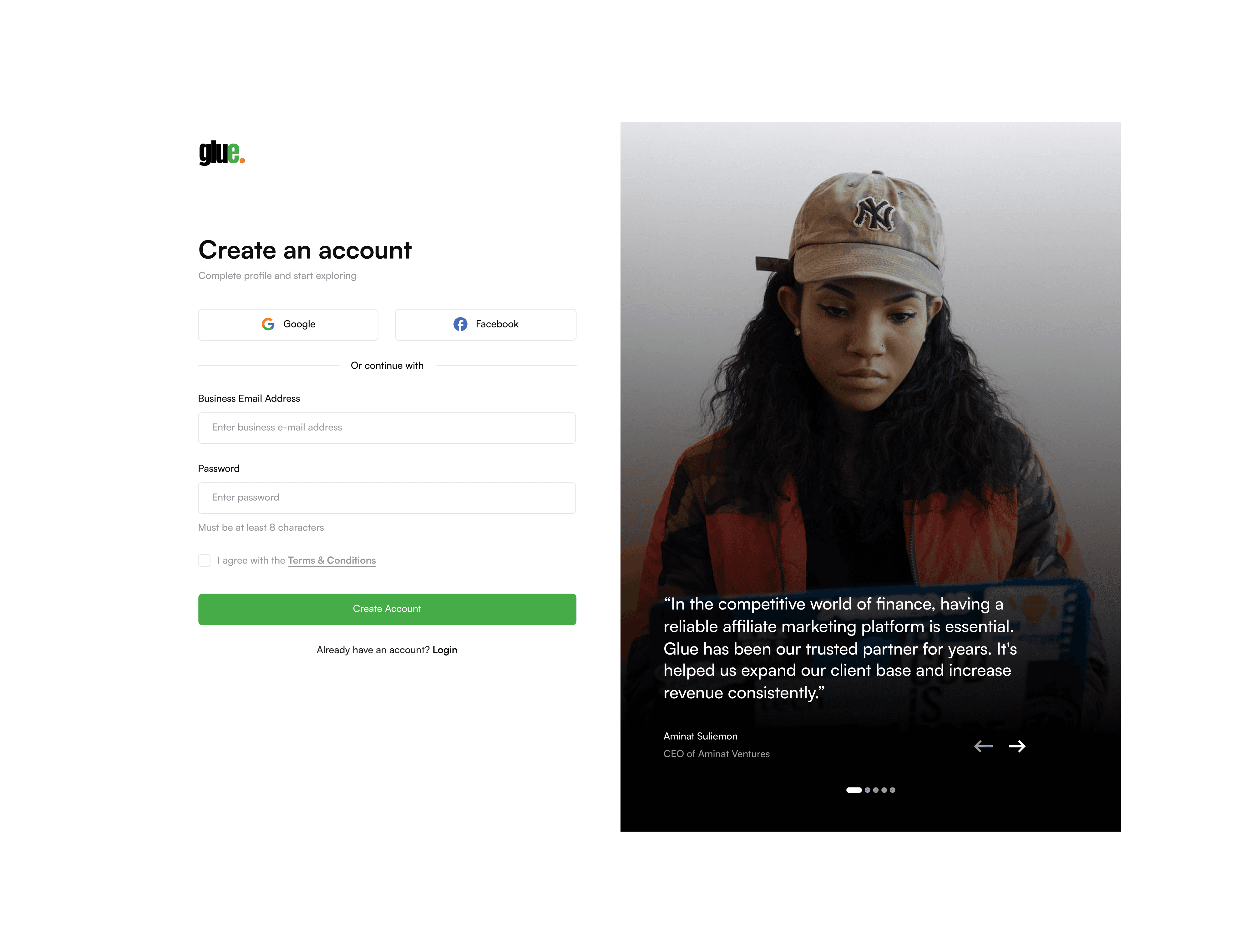AS MY FIRST MAJOR CLIENT PROJECT, THIS WAS A SIGNIFICANT OPPORTUNITY TO PROVE MYSELF AND WHAT I HAD LEARNED. THE BRIEF FROM GLUE, WAS TO CREATE AN AFFILIATE MARKETING PLATFORM THAT NEEDED A USER INTERFACE FOR ITS MERCHANT PARTNERS. THE CHALLENGE WAS TO CREATE A COMPREHENSIVE DASHBOARD AND A BRAND IDENTITY FROM SCRATCH, ALL WHILE BUILDING A USER-FRIENDLY EXPERIENCE FOR SMALL BUSINESS OWNERS AND CONTENT CREATORS. THE GOAL WAS TO PROVIDE A CLEAN, AND INTUITIVE PLATFORM WHERE MERCHANTS COULD TRACK THEIR SALES, MANAGE PRODUCTS, AND COLLABORATE WITH AFFILIATES SEAMLESSLY.