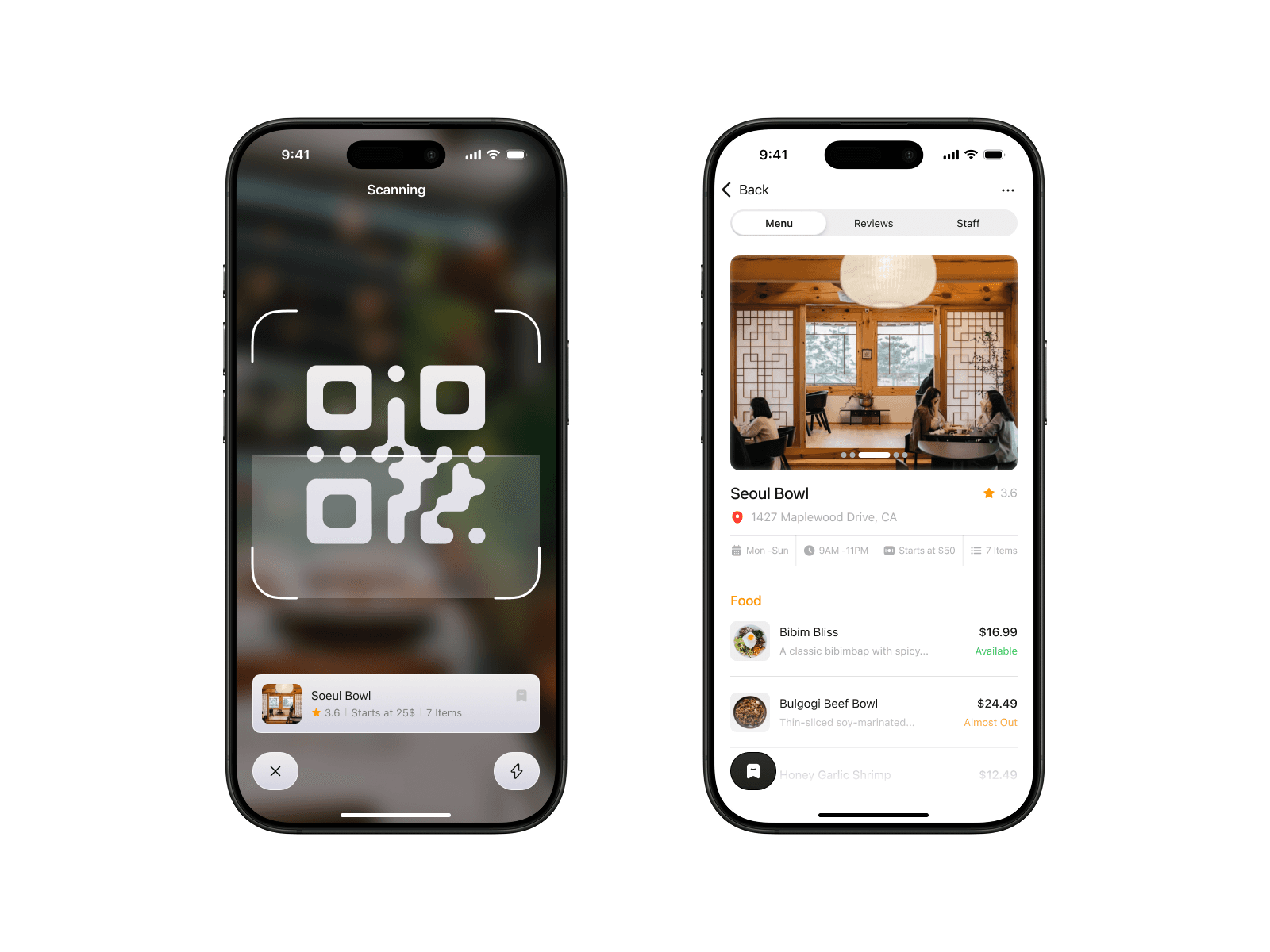 THE "SCANNING" PAGE WAS THE HEART OF THE IN-RESTAURANT EXPERIENCE. I WANTED TO MAKE IT FEEL EFFORTLESS, LIKE MAGIC. FOCUSING ON A LARGE, CENTRAL QR CODE READER THAT INSTANTLY PULLED UP THE MENU, BYPASSING ANY COMPLICATED SEARCH OR CHECK-IN PROCESS. THE FINAL KEY SCREEN WAS THE INDIVIDUAL RESTAURANT PAGE. THE FLOW WAS DESIGNED TO BE AS SIMPLE AS TAP, VIEW, ORDER, AND DINE.